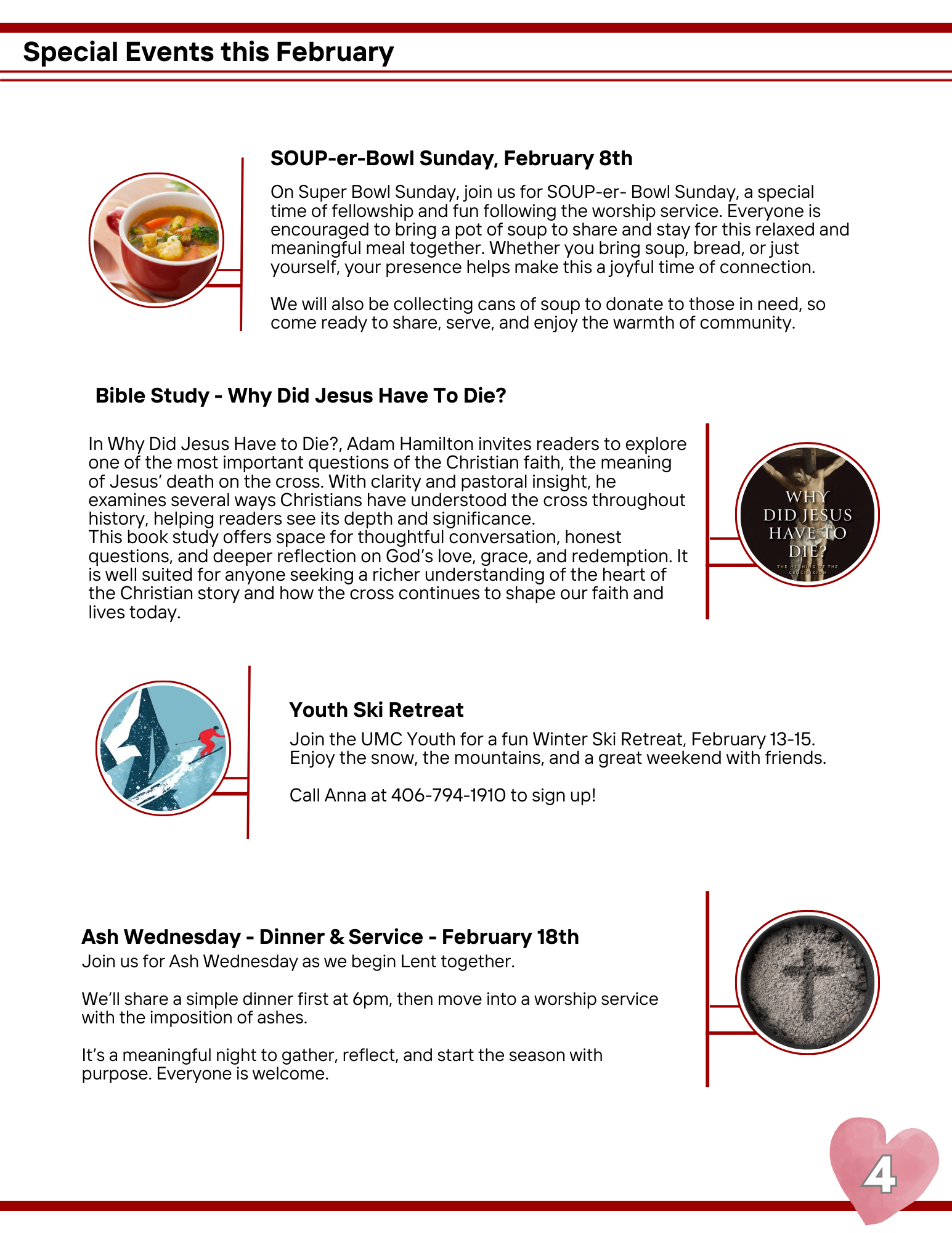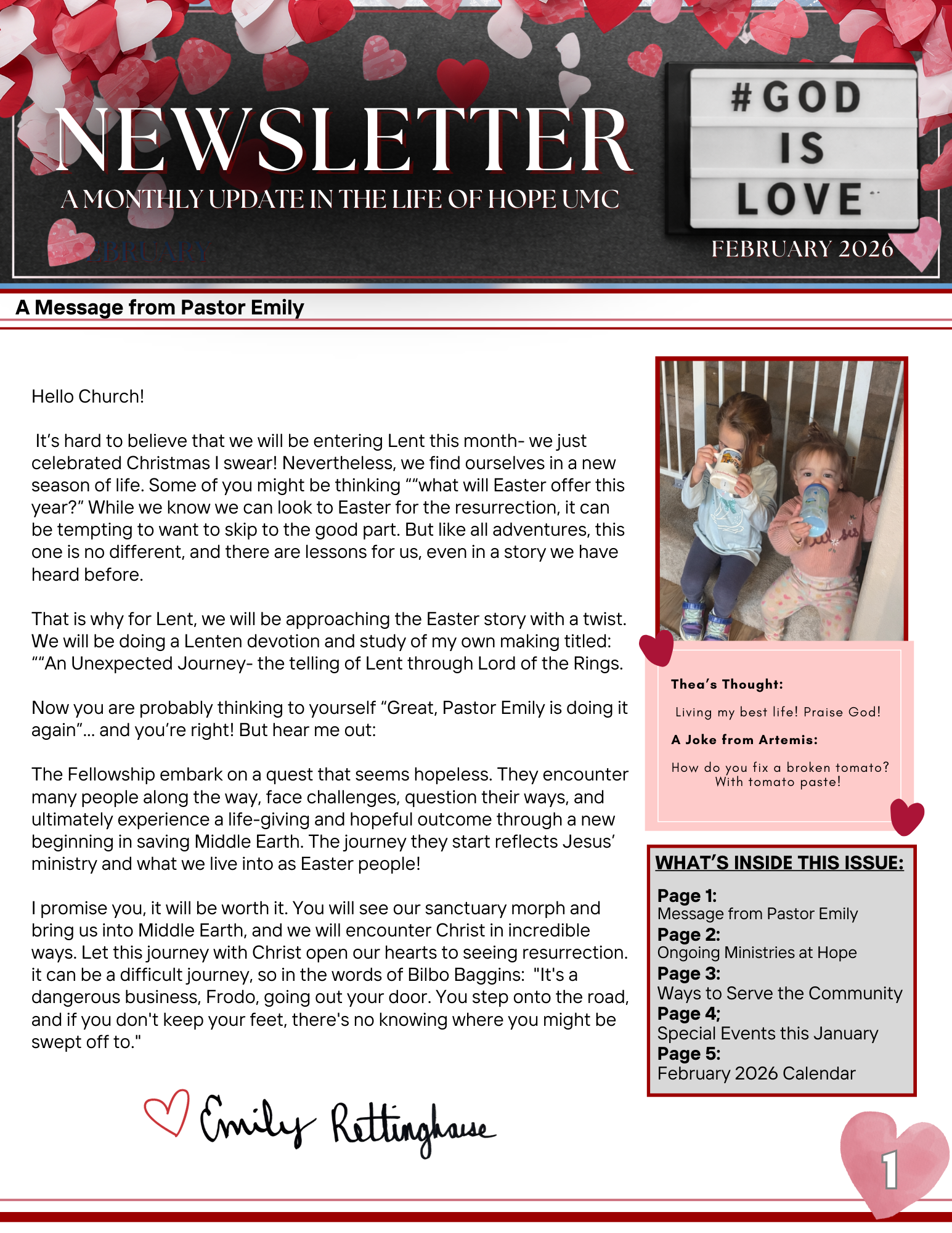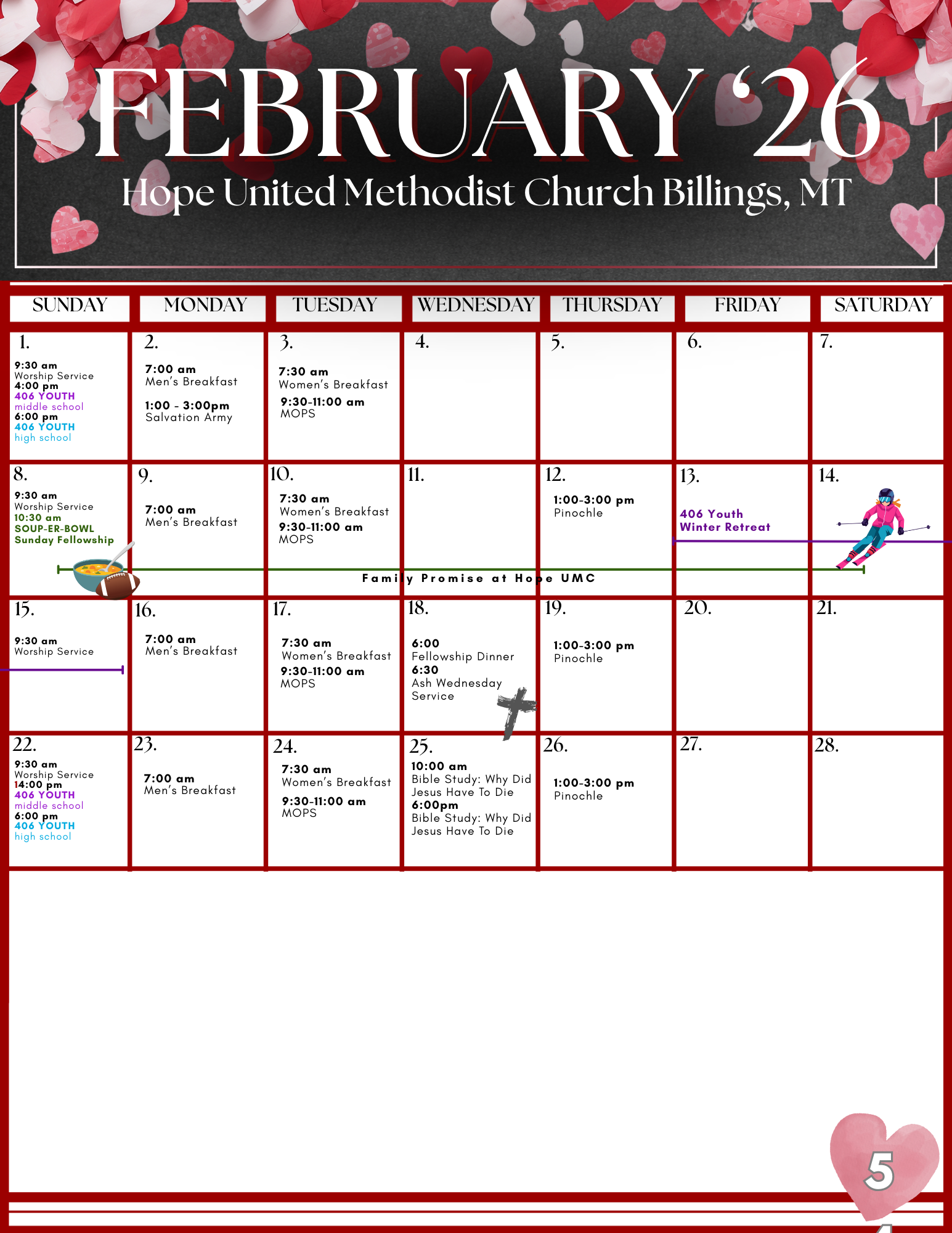 Here you’ll find our monthly Newsletter. It shares all the activities and events happening at Hope UMC. If you have any content you’d like to see in a month’s newsletter, you can contact Pastor Emily at pastoremily@hopeumcbillings.org